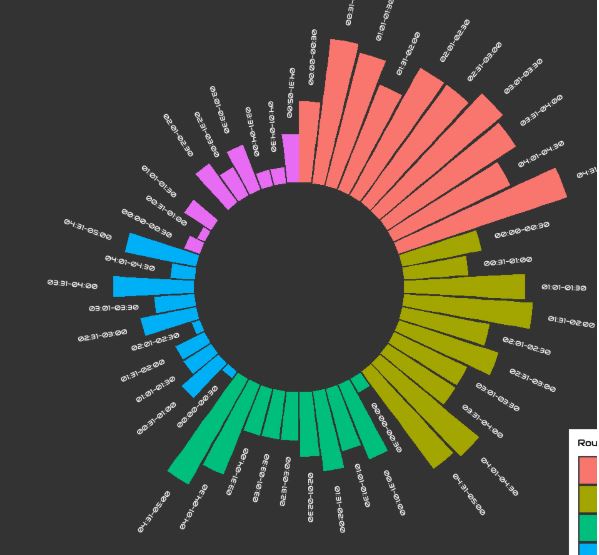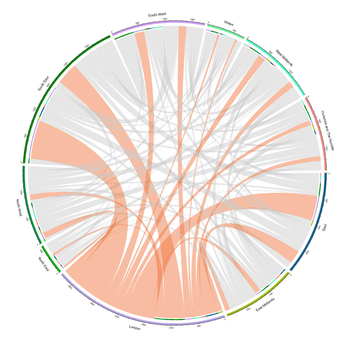 Visualizes relationships between groups in a circular layout, where connecting arcs show the strength of connections.
