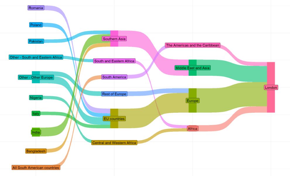 Shows how quantities flow between stages or categories, with thicker lines representing larger flows.